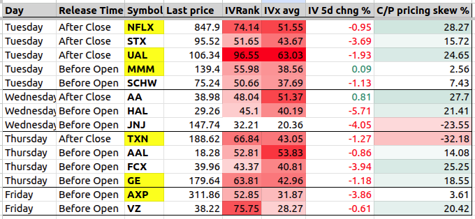 I’ll pay special attention to the symbols highlighted in yellow ( NFLX 0.00%↑ UAL 0.00%↑ MMM 0.00%↑ TXN 0.00%↑ GE 0.00%↑ AXP 0.00%↑ ), chosen either for their high IV or their notable call/put pricing skew.